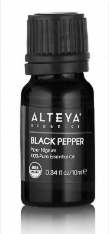 Biologische essentiële zwarte peperolie wordt gewonnen uit gedroogd fruit van de Piper nigrum-plant door middel van stoomdestillatie. Het heeft een droge, houtachtige en kruidige geur. De kleur is transparant tot lichtgeel. Zwarte peperolie bevordert het plassen en zweten, het reinigt de darmen en geneest infecties in het spijsverteringsstelsel. De olie biedt verlichting van krampen, spasmen en convulsies, een effectieve remedie voor het genezen van reuma en artritis. Het vertraagt nadelige effecten van veroudering, zoals verlies van gezichtsvermogen, maculaire degeneratie, rimpelvorming van de huid, degeneratie en loskomen van de spieren, verlies van beweeglijkheid in de gewrichten, zenuwaandoeningen en geheugenverlies. De zwarte peperolie helpt gassen te verwijderen en voorkomt extra gasvorming in de maag en in de darmen.
